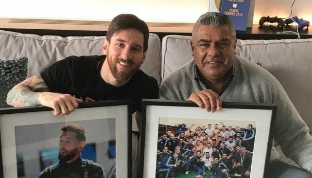 El presidente de la Asociación del Fútbol Argentino visitó a la Pulga y le ofrendó dos cuadros con fotos de Selección.