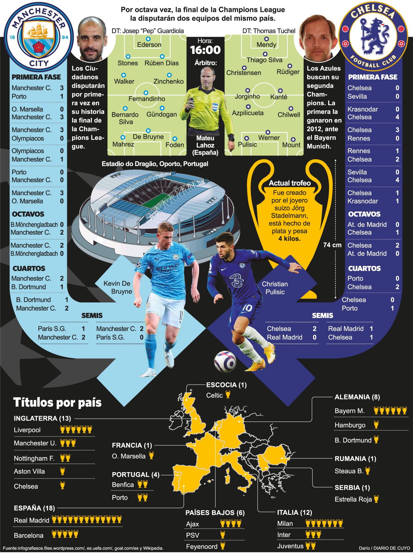 Manchester City, con la probable presencia del argentino Sergio Agüero como suplente en su despedida del club, y Chelsea protagonizarán hoy una final de Liga de Campeones de la UEFA plenamente inglesa en la que será la octava vez en que dos equipos de un mismo país definen el prestigioso certamen. Esta final se jugará en el Estadio do Dragao, en la ciudad portuguesa de Oporto, con capacidad para 50.033 espectadores, aunque este ocasión a causa de la pandemia de coronavirus sólo habrá 12.000, desde las 16 de Argentina con el arbitraje del español Mateu Lahoz y televisada por ESPN.