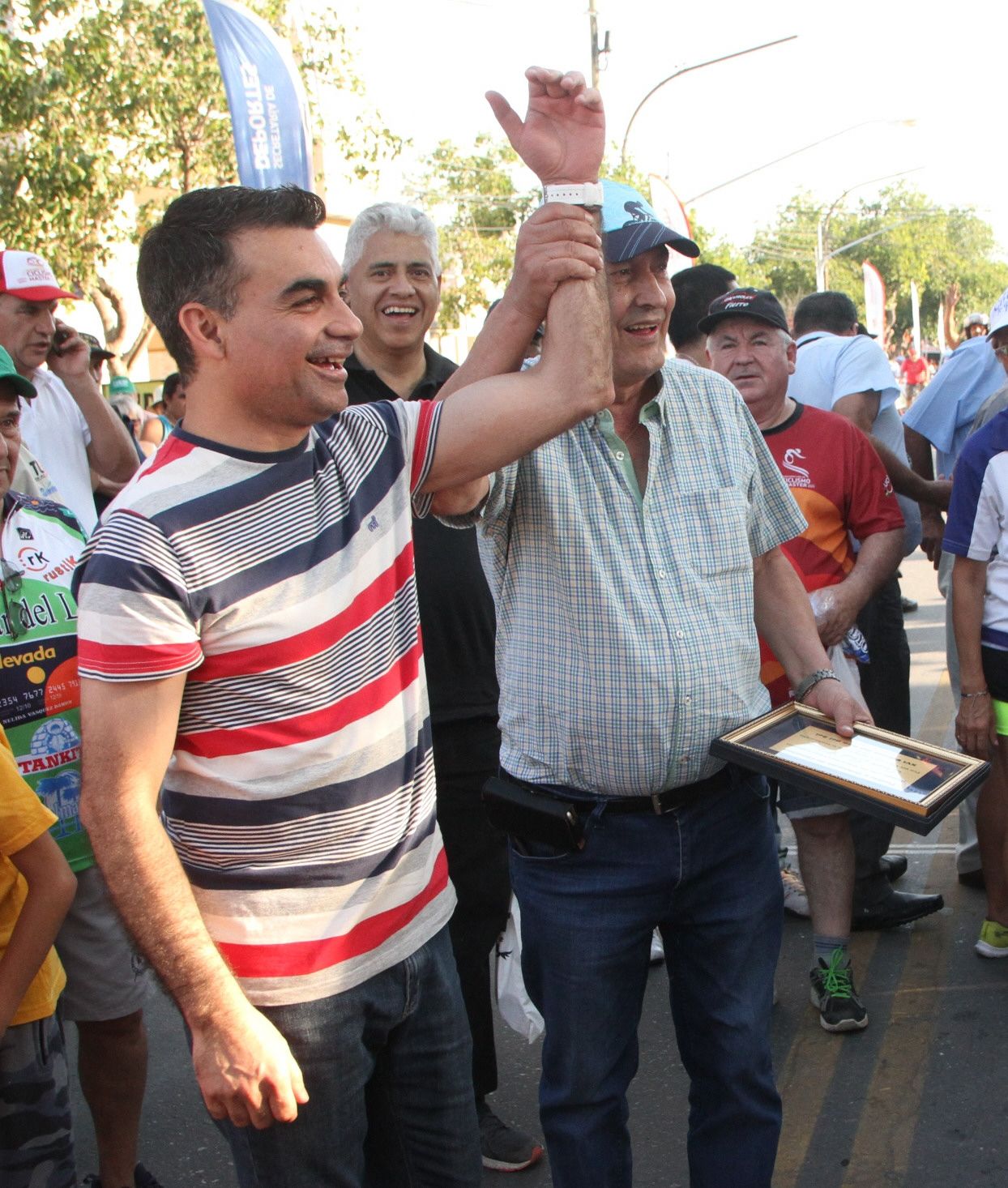 Aun habiendo perdido una apuesta con Héctor Lucero, que saldó con este cronista como testigo, Juan José Chica estaba muy feliz por lo vivido en Chimbas. Quien, nacido en Motril, España, recaló muy chico en tierras chimberas, festejó con el intendente Fabián Gramajo el éxito que fue la etapa de ayer, en la que se pusieron a prueba algunas de las medidas de seguridad previstas para la Vuelta a San Juan.