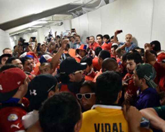 La tensión y el nerviosismo se apoderaron de la enorme sala de prensa del Estadio Maracaná, minutos antes del inicio del encuentro entre España y Chile, por el Grupo B del Mundial Brasil 2014. Es que alrededor de 100 hinchas chilenos sin entradas para el partido ingresaron a las corridas, ocasionaron destrozos y se enfrentaron con la seguridad privada la FIFA y con la policía brasileña, que lograron detenerlos.