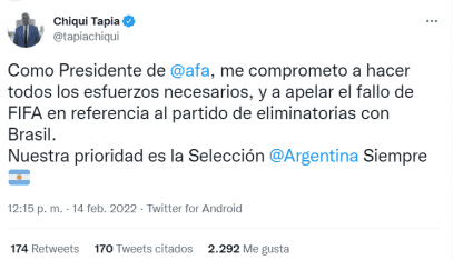 "Como Presidente de AFA, me comprometo a hacer todos los esfuerzos necesarios, y a apelar el fallo de FIFA en referencia al partido de eliminatorias con Brasil. Nuestra prioridad es la Selección Argentina Siempre", escribió el mandamás del fútbol local en su cuenta de Twitter minutos después de conocerse la determinación.