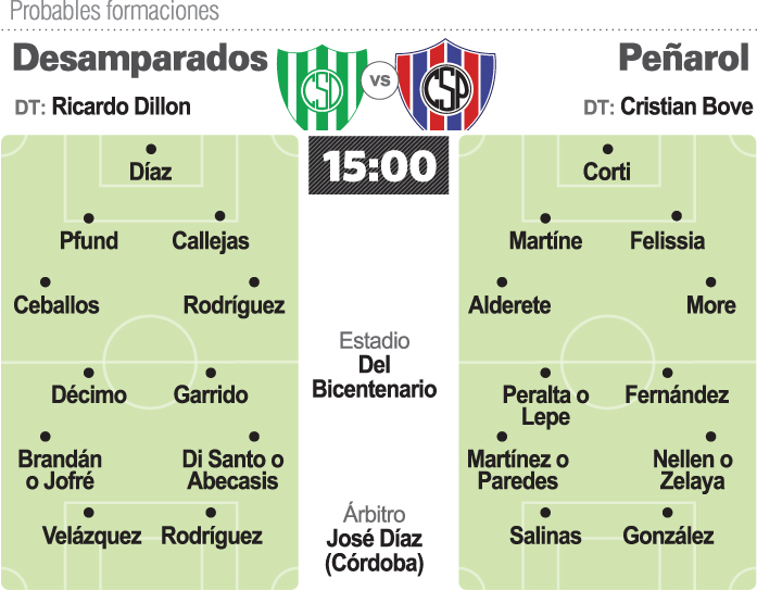 ¿Cuál club está más urgido? En lo numérico la respuesta es clara: Desamparados. Se encuentra último en las posiciones y por ende perdiendo la categoría. Si bien con el regreso del entrenador, Ricardo Dillon, las cosas se acomodaron un poco con una victoria y un empate, la derrota la fecha pasada ante Ferro, en La Pampa, lo ubicó nuevamente en la última colocación. Aunque ha tenido una mejoría en el juego, el cuadro sigue siendo angustiante aunque reste casi toda la segunda rueda del torneo. El Flaco ha probado diferentes nombres y hoy se inclina por los que considera los más aptos para un duelo de este calibre, con mucho roce y dinámica.
