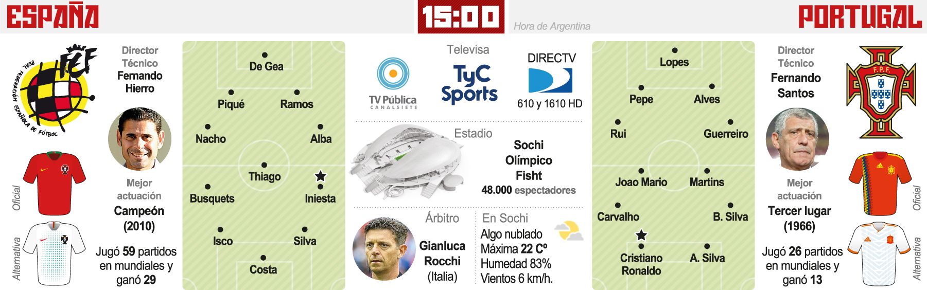 El partido largará a las 15 (hora argentina) y mostrará, de entrada, dos momentos anímicos diferentes. Los españoles todavía asombrados por la destitución de su técnico Julen Lopetegui. Y los lusitanos con toda la fuerza e ilusión de hacer un buen Mundial sabiendo que son los actuales campeones de la Eurocopa.