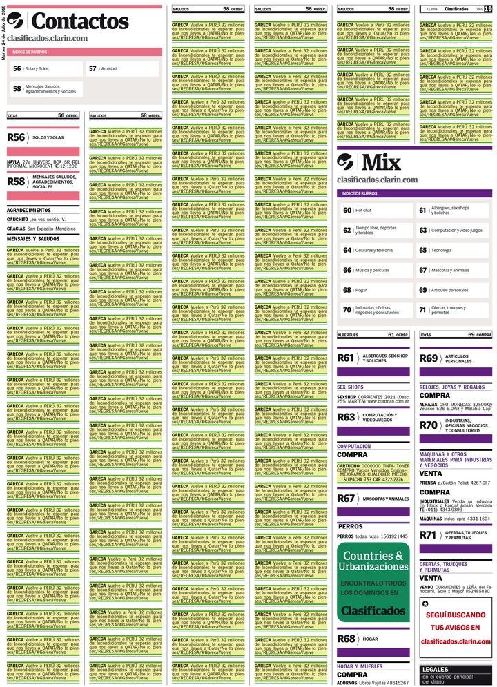 En el rubro 58 y debajo de dos agradecimientos para el Gauchito Gil y para San Expedito, cien mensajes de cuatro líneas, sobre un fondo verde claro y con bordes algo más oscuros, impactan a primer golpe de vista. Todos dicen lo mismo: “GARECA vuelve a Perú 32 millones de Incondicionales te esperan para que nos lleves a Qatar / No lo pienses / Regresa / #GarecaVuelve”.