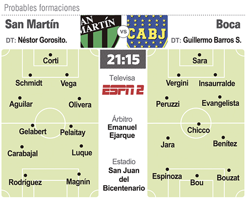 San Martín tendrá a Corti en el arco y toda la defensa será nueva: Aguilar, Schmidt, Vega, Olivera. En el medio el doble 5 será de Gelabert y Pelaitay, mientras que por las bandas lo harán Carabajal y Luque. Arriba el uruguayo Rodríguez se moverá con soltura y en el área Magnín será sobre quien estarán muchas miradas dado que hay muchas esperanzas puestas en su desempeño y capacidad.