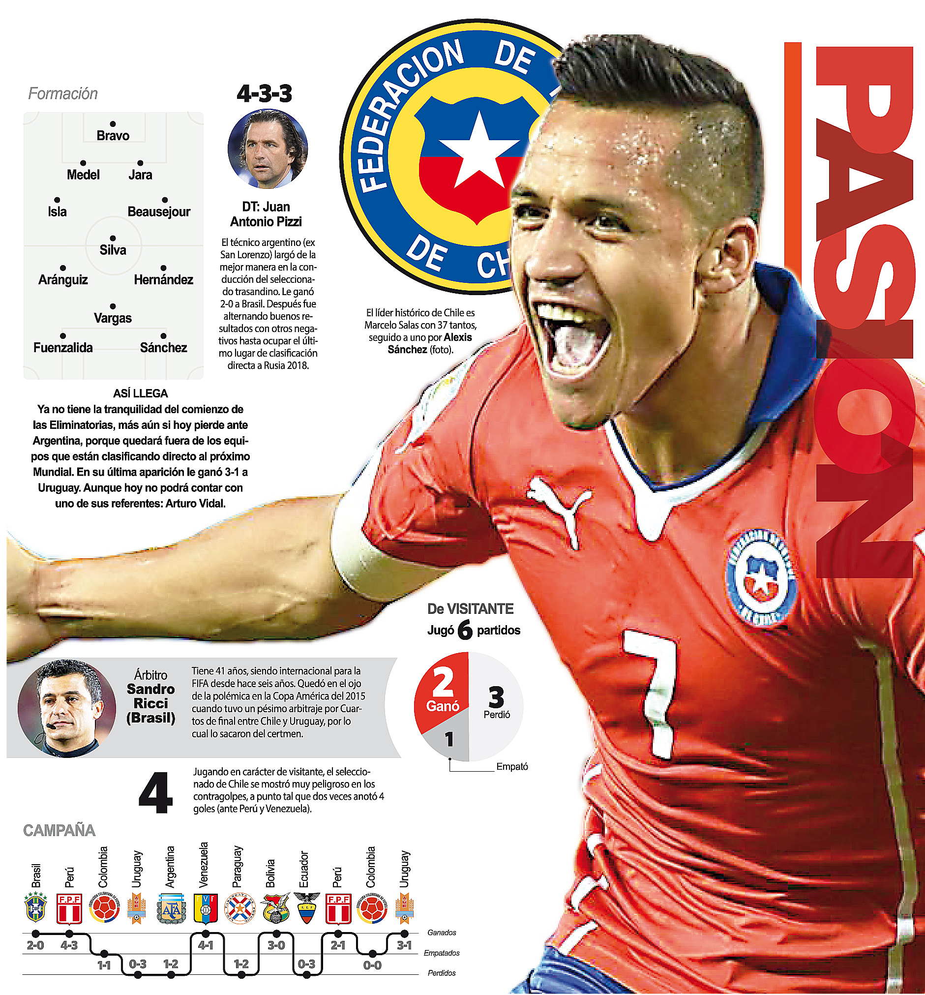 En Chile, el director técnico santafesino Juan Antonio Pizzi no podrá contar con su máxima figura, Arturo Vidal, por suspensión, ni con el lesionado Marcelo Díaz. El reemplazante de Díaz será justamente un argentino, el tucumano nacionalizado chileno Pablo Hernández.