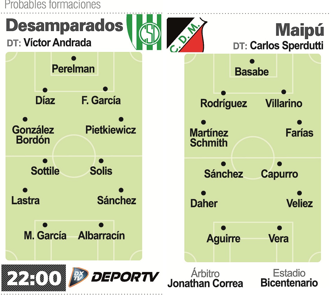 En Maipú, la gran baja de la semana fue el desgarro del experimentado Nicolás Olmedo -figura ante Racing- ingresando en su lugar Sergio Sánchez y manteniendo el resto de la formación que comenzó con triunfo en esta Zona 3. La historia es larga entre Desamparados y Maipú. Jugaron en 22 ocasiones, con 6 triunfos del Puyutano y 8 del Cruzado, empatando en las restantes 8 ocasiones. Es clásico y tiene su particular trascendencia. Para Desamparados, arrancar con su gente y renovando esas ilusiones que lo potencian en cada temporada parece ser el mejor movilizador para esta noche en el Bicentenario.