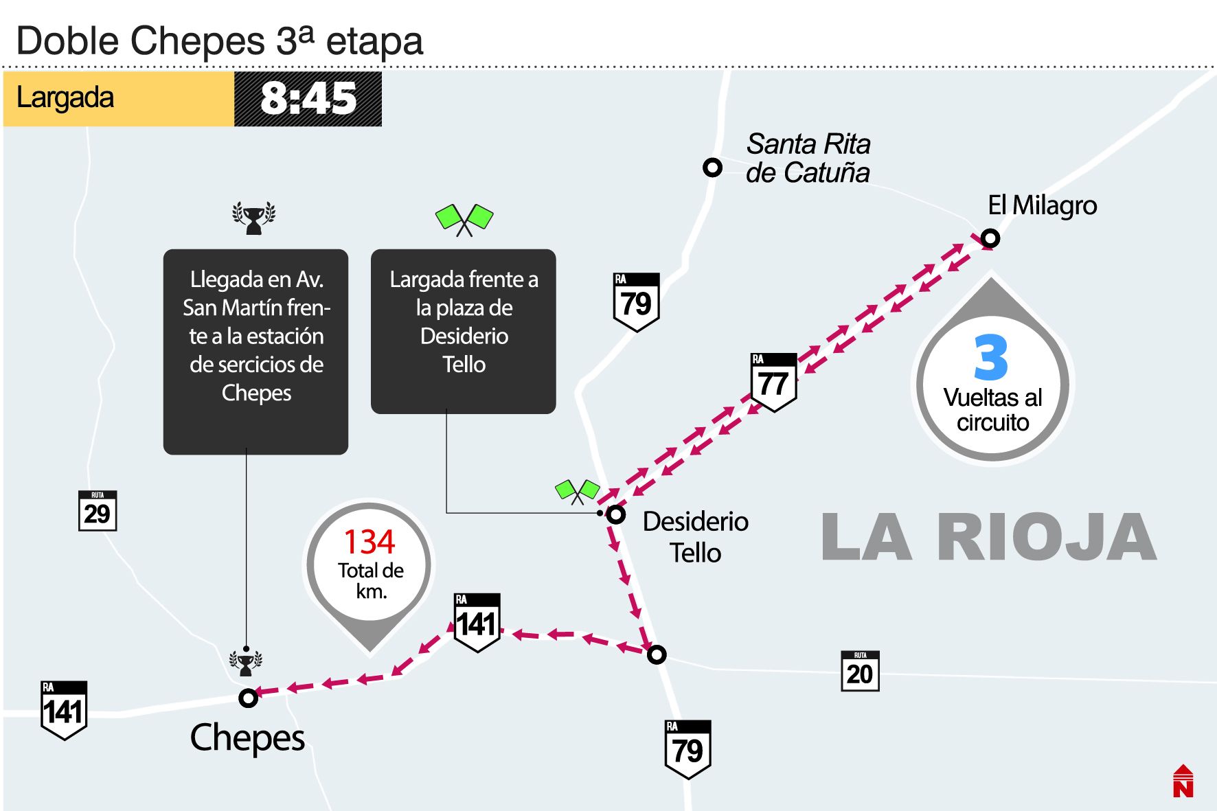 Hoy, desde las 8.45 se disputará un tramo que tendrá punto de lanzamiento en el distrito de Desiderio Tello, irá hasta la localidad de Milagros, y volverá sobre sus pasos para cruzar otra vez por Tello y culminar en Chepes (ver página 39).