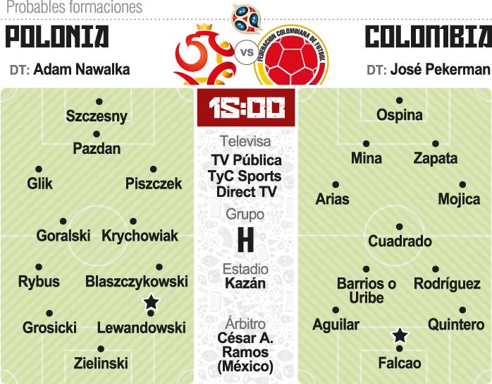 Colombianos y polacos, ambos perdedores en la fecha inicial y con idéntico riesgo de quedar eliminados, se medirán hoy a partir de las 15 en el estadio Kazán Arena con el arbitraje del mexicano César Arturo Ramos y transmisión de la Televisión Pública y DirecTV.