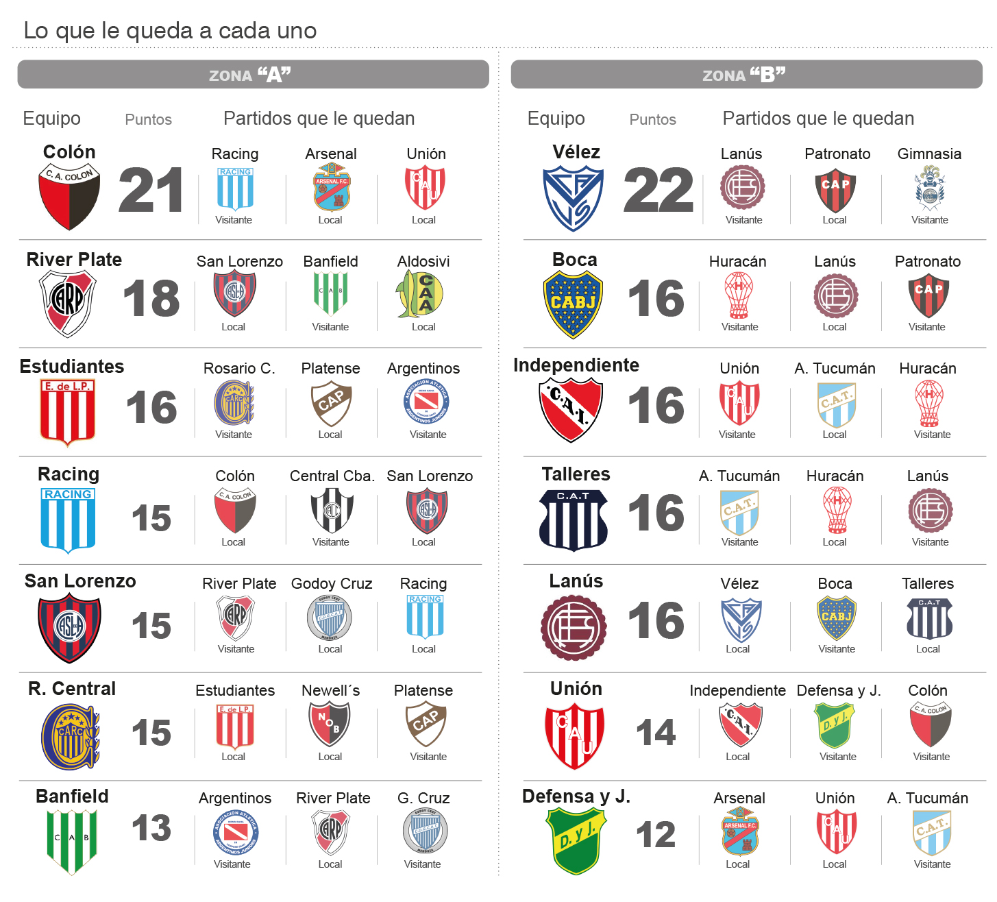 Ante ese panorama todo se convierte en incierto pensando en la clasificación de los equipos que deberán jugar los cuartos de final. Como hay dos zonas, por cada una pasarán cuatro equipos. Faltan tres fechas para el final de la ronda inicial y los candidatos son varios para ocupar esos lugares. Aunque ya hay dos que están distanciados al frente y tienen un pie en la siguiente ronda. Justamente son los dos líderes actuales de las zonas: Colón y Vélez. Los Sabaleros y los del Fortín han logrado sacarle seis puntos a los que están entrando en el cuarto lugar. Y eso, cuando restan nueve en juego, no es poco. Quiere decir que logrando una victoria en la próxima fecha, casi que están adentro.