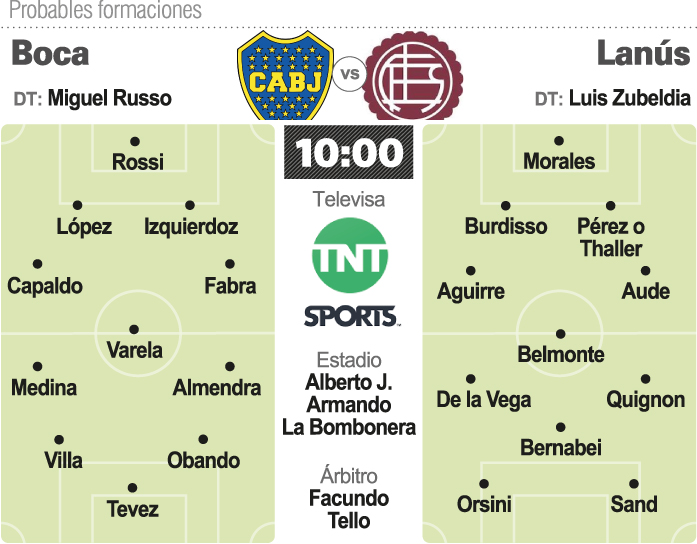 Con muchas ausencias, la del sanjuanino Emmanuel Mas y la del colombiano Cardona (por una cardiopatía no estará hoy) como las más notorias, Boca recibirá a las 10 horas a un Lanús obligado a ganar para mantener alguna esperanza. Miguel Angel Russo cito 24 jugadores, 13 de ellos fraguados en la cantera xeneize. El entrenador armará un "mix" resguardando titulares para el choque de pasado mañana ante Barcelona, en Guayaquil, por la tercera fecha de la Copa Libertadores.