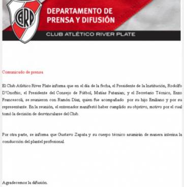 El comunicado oficial informó, además, que ‘Gustavo Zapata y su cuerpo técnico asumirán de manera interina la conducción del plantel profesional‘ en el próximo compromiso, que será el sábado en el superclásico ante Boca Juniors a disputarse en el estadio Azteca de México DF.