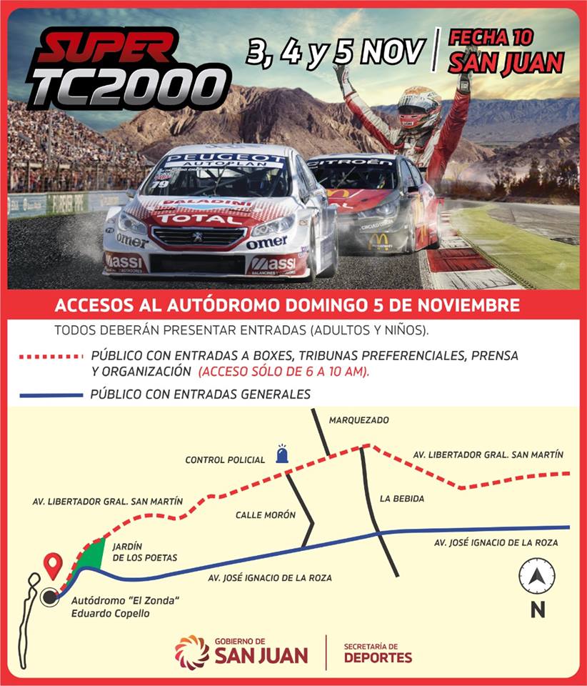De 6 a 10 hs del domingo 5 de noviembre, deberán acceder por Av. José Ignacio de la Roza hacia el autódromo El Zonda, el público con entrada general sin excepción.