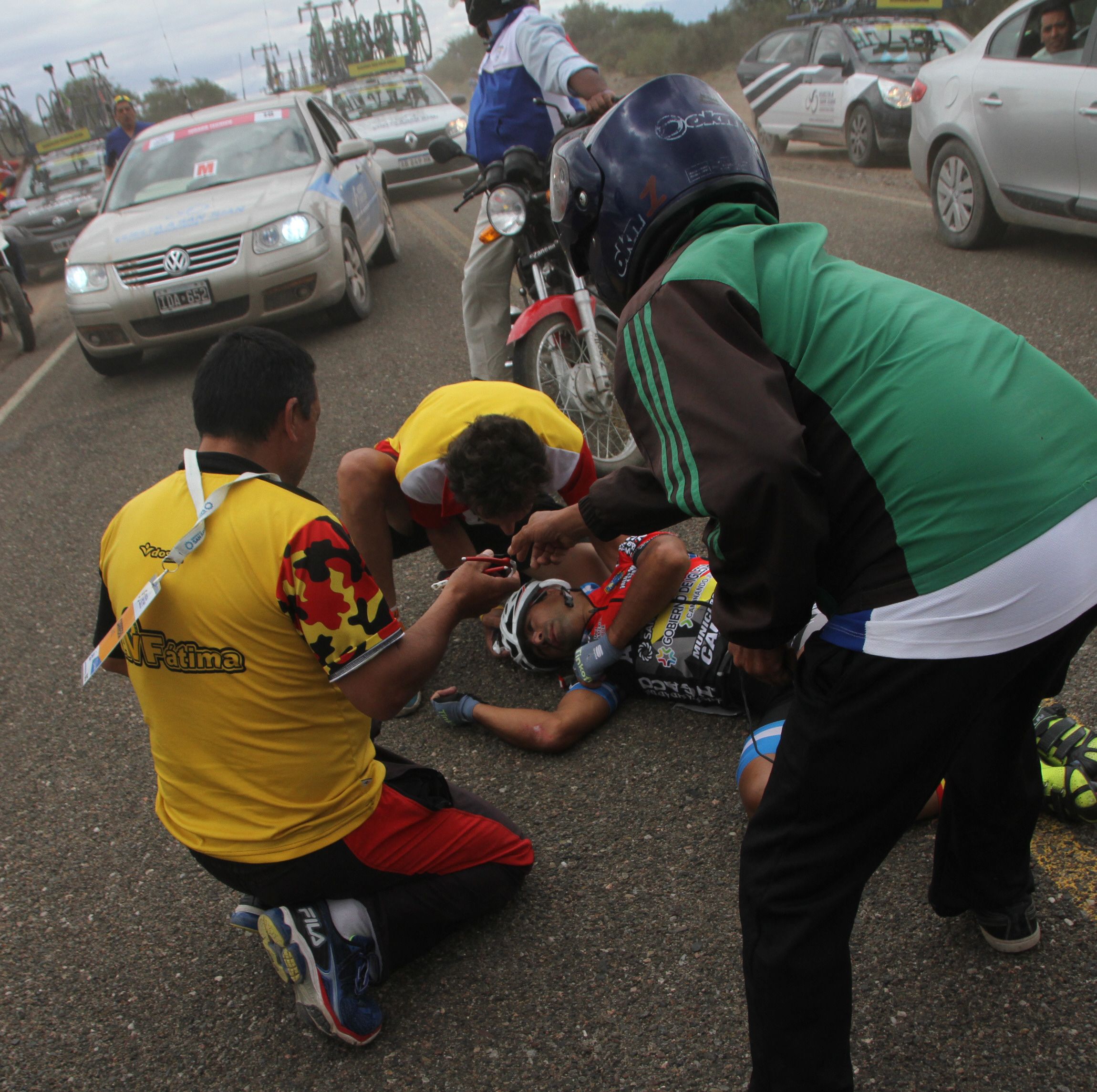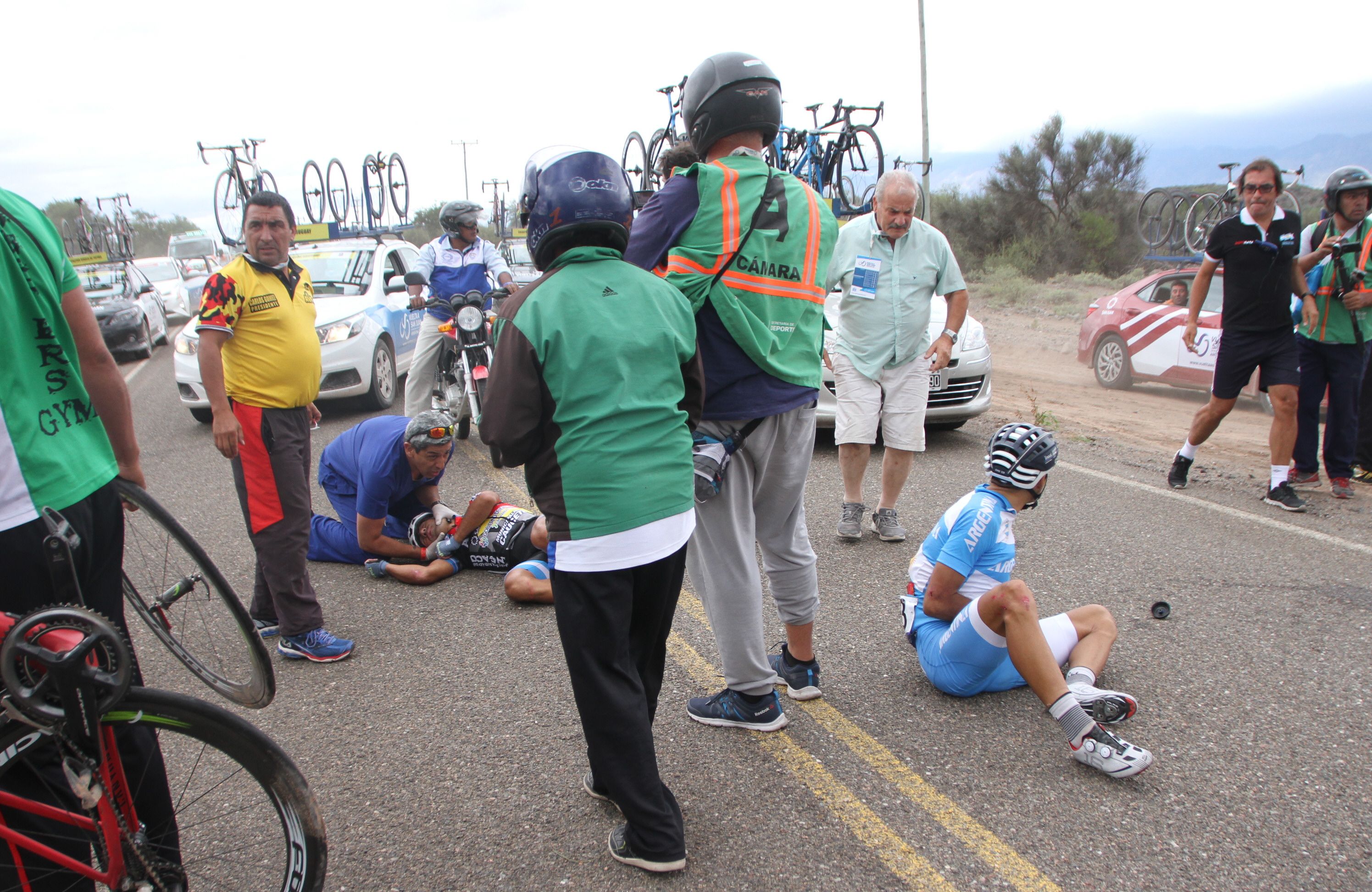 De ellos el de la Agrupación se llevó la peor parte. Porque el golpe que sufrió en el tórax lo derribó de la bici y se golpeó en la nuca, lo que le provocó pérdida de conocimiento. Todos fueron trasladados en helicóptero hasta San Juan e inmediatamente trasladados a la Clínica El Castaño. El “piquetero” era hasta el momento el mejor sanjuanino ubicado en la clasificación general, el mérito lo había hecho en la etapa del lunes en Punta Negra arribando segundo, y el miércoles en la contrarreloj no había hecho una buena crono pero le había bastado para quedar a 27 segundos del líder.
