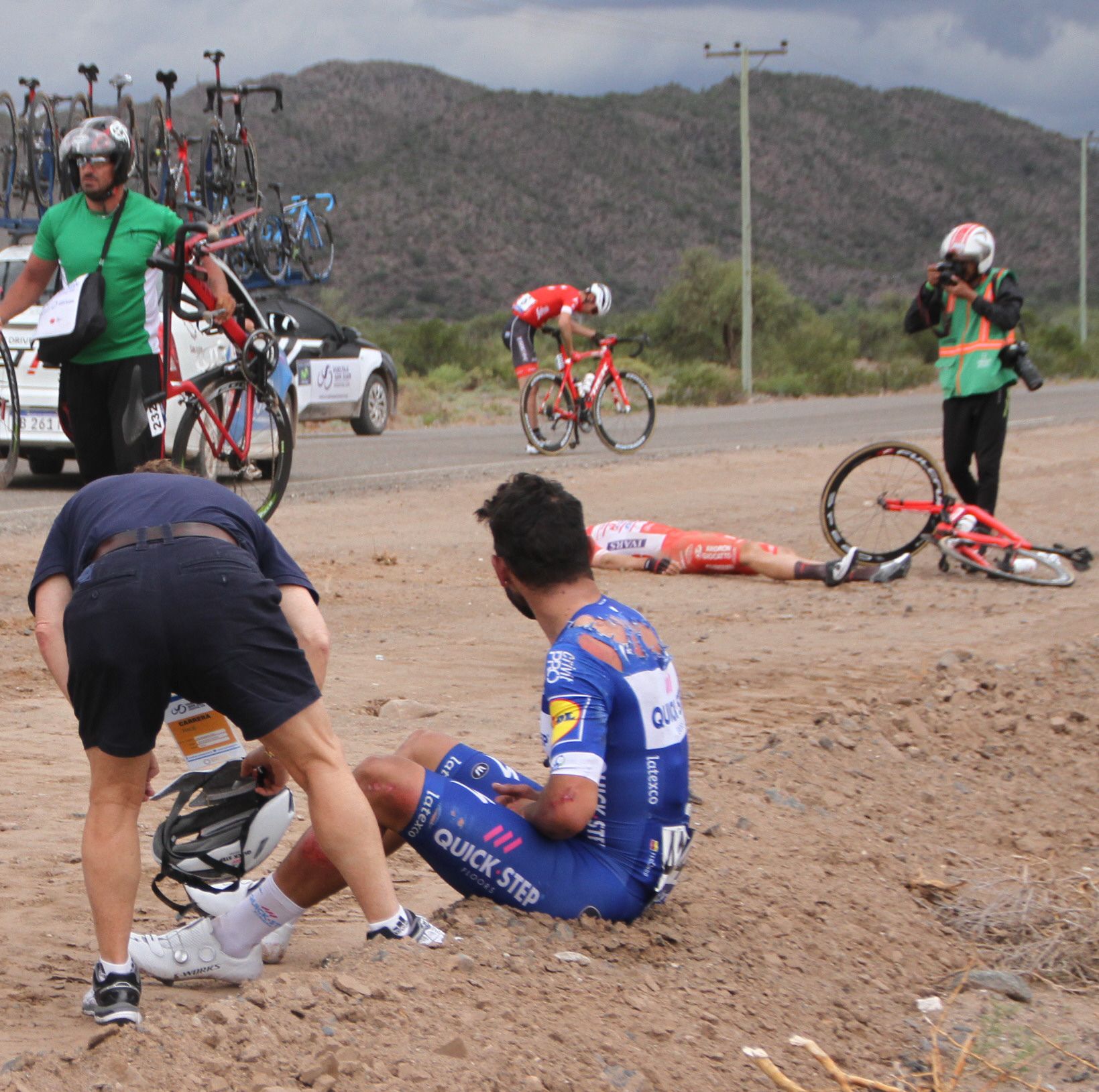 Fue la noticia más resonante del día. Y la peor novedad en lo que va de la Vuelta Internacional a San Juan. La dura caída que sufrió Ricardo Escuela y obligó a su deserción de la prueba, provocó la incertidumbre en la afición sanjuanina, sabiendo que el barrealino era el único que le podía dar pelea a los candidatos World Tour de aquí hasta el final. En esa rodada también debieron abandonar otro sanjuanino, Rubén Ramos (Selección Argentina), el colombiano y otro serio candidato, Fernando Gaviria (Quick Step Floors), y el italiano Manuel Belletti (Androni).