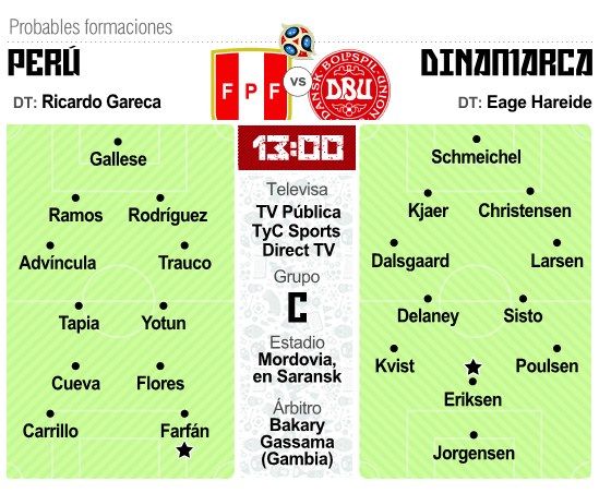 El seleccionado de Perú, conducido por el entrenador argentino Ricardo Gareca, y tras 36 años sin mundiales, enfrentará mañana a Dinamarca, que también vuelve a la competencia luego de haber jugado por última vez en Sudáfrica 2010, en un partido del Grupo C que integran también Francia y Australia.