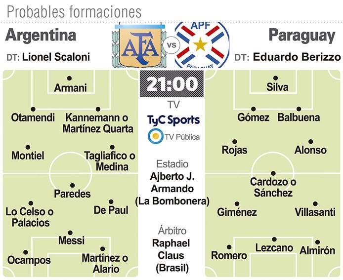 Luego de algunas complicaciones por lesiones y retrasos en los vuelos, Argentina saldrá hoy a la cancha desde las 21 horas en una Bombonera vacía como marcan los tiempos del Covid-19 para recibir a Paraguay, por la tercera fecha de las Eliminatorias Sudamericanas. Si bien el entrenador, Lionel Scaloni, no lo oficializó ayer en conferencia de prensa, quedó claro que el capitán, Lionel Messi, estará desde el arranque en el choque contra los dirigidos por Eduardo Berizzo, pese a la molestia que tiene en su tobillo y que lo marginó el sábado de la titularidad en Barcelona. Además, se espera que en la ofensiva, la albiceleste cuente con Lautaro Martínez, ya recuperado de una molestia en su glúteo derecho, siendo acompañado por Lucas Ocampo. La duda pasa por el fondo, donde Lucas Martínez Quarta será evaluado hoy y habrá una definición, ya que arribó al país ayer por la mañana tras demorarse su salida de Italia debido a un compañero de Fiorentina que dio positivo y el Chino no tenía la habilitación especial para emigrar de Firenze. Tras las primeras dos fechas, Argentina manda junto con Brasil, ambos con puntaje ideal de seis puntos. Mientras que Paraguay se ubica cuarto, con cuatro puntos.