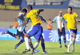 El primer tiempo, tal cual lo anticipaban los planteos de uno y otro entrenador, nació con Brasil intentando poner mucha gente en posiciones rivales y con Argentina reduciendo los espacios con la línea defensiva muy cerca de Ustari y con los volantes achicando para atrás. Con ese simple argumento, el equipo de Sabella le fue cerrando los caminos a las intenciones de Brasil y el partido entró en un terreno repetido y monótono. Pero a los 19’ Maxi Rodríguez, Juan Manuel Martínez y Clemente Rodríguez se asociaron en el ataque y nació el primer gol del juego. Tocaron Maxi y Clemente, vino el centro al medio y Martínez no perdonó para poner el 1-0 en favor de un Argentina que llegó por primera vez y convirtió. Brasil intentó llevarse por delante al conjunto albiceleste pero le faltaron ideas como para romper el dispositivo de Sabella. Pero a los 25’ Brasil encontró el empate de la única forma que podría hacerlo: de pelota parada. Marcaron mal, entró Paulinho solo y puso el 1-1 que acercaba justicia al mediocre trámite porque Brasil también llego una vez y marcaba.