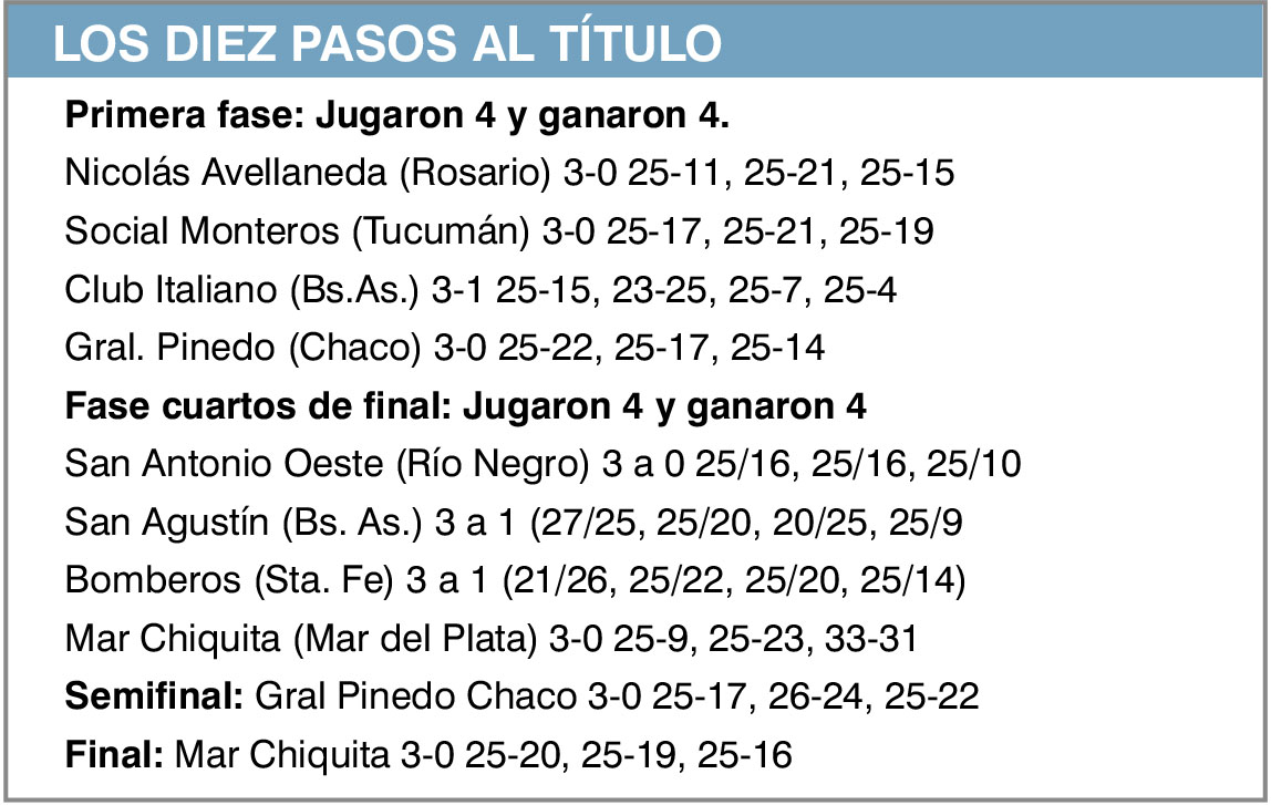 Lo mismo les ocurrió en la final, la que debieron disputar con el elenco de Mar Chiquita, al que habían vencido en el último partido de los cuartos de final, en encuentro que empezaron ganando 25-9 y después se quedaron con los otros dos set por diferencia mínima (25-23 y 33-31).