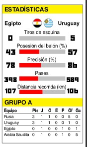 Uruguay fue un poco más. Equivocado buscó más. Y merecía algo más. Su premio lo tuvo en el último suspiro cuando el zaguero del Atlético Madrid, Giménez, se puso la ropa de Godín, su compañero en los ‘colchoneros’ y en la selección uruguaya y con un cabezazo furibundo enterró las expectativas de un Egipto prolijo y ordenado que sin su as de espadas jugó sus expectativas al envido y chocó con los ’33 orientales" que Uruguay tenía de mano.
