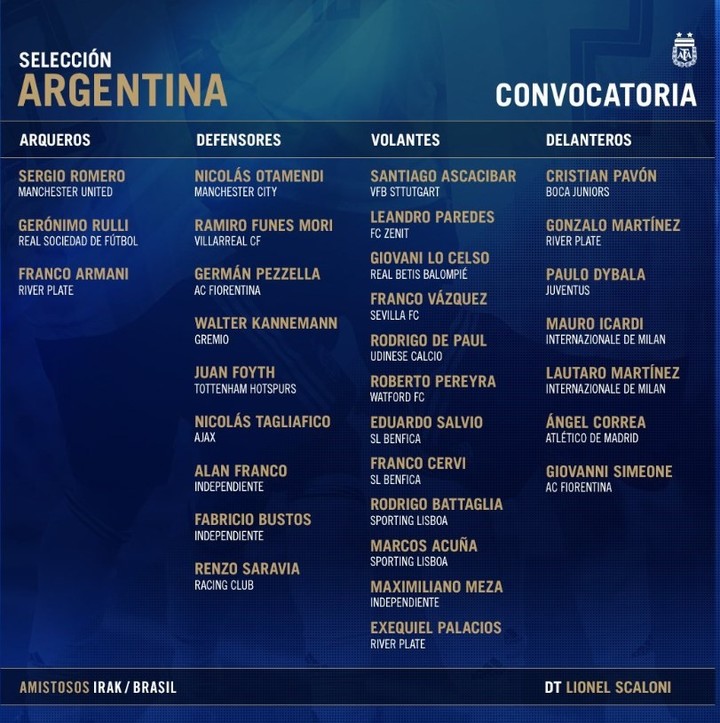 Entre las confirmaciones, el DT le devolvió la confianza a los tres arqueros. Sergio Romero, Gerónimo Rulli y Franco Armani fueron los tres citados. Hasta hace una semana se especuló con la posible presencia de Esteban Andrada, pero lo fractura en el maxilar inferior sufrida jugando Copa Libertadores para Boca lo dejó fuera de la carrera.