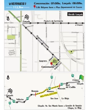 El pelotón partirá a las 8 de la mañana desde la Plaza departamental de Caucete y por Diagonal Sarmiento irán por Paula Albarracin de Sarmiento para luego tomar la Ruta 141 con destino a La Rioja. Después de pasar la Difunta Correa habrá una neutralización en Bermejo, los ciclistas se subirán a las movilidades para retomar la competencia nuevamente en Mascasín, ya en suelo riojano. La llegada será en el centro chepeño donde se conocerá al primer líder del día.