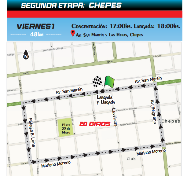 Por la tarde tendrá lugar la segunda etapa de la Chepes, la largada será a las 18 y se disputará íntegramente en un circuito en esa localidad riojana donde girarán 20 veces para totalizar 48 kilómetros.