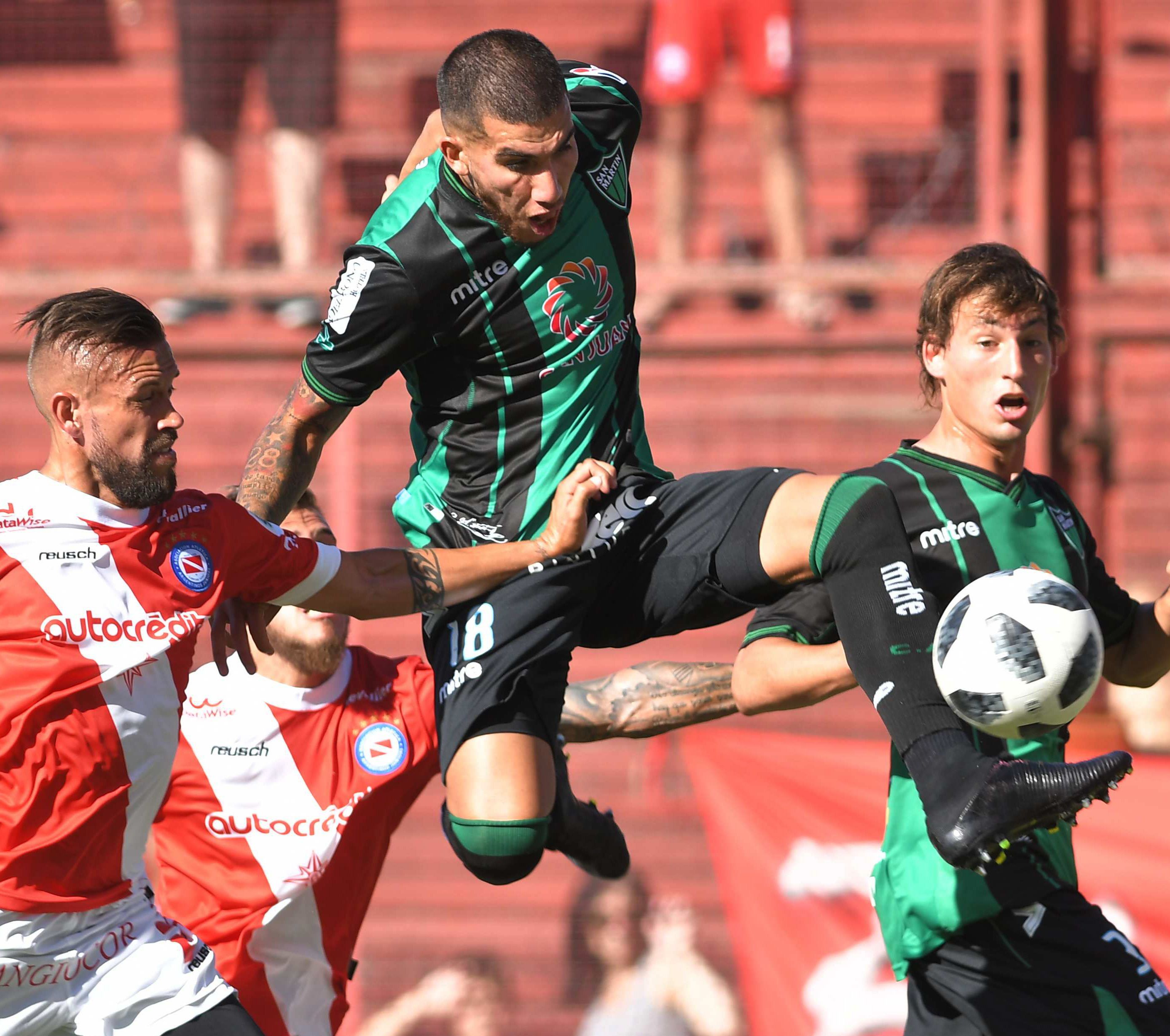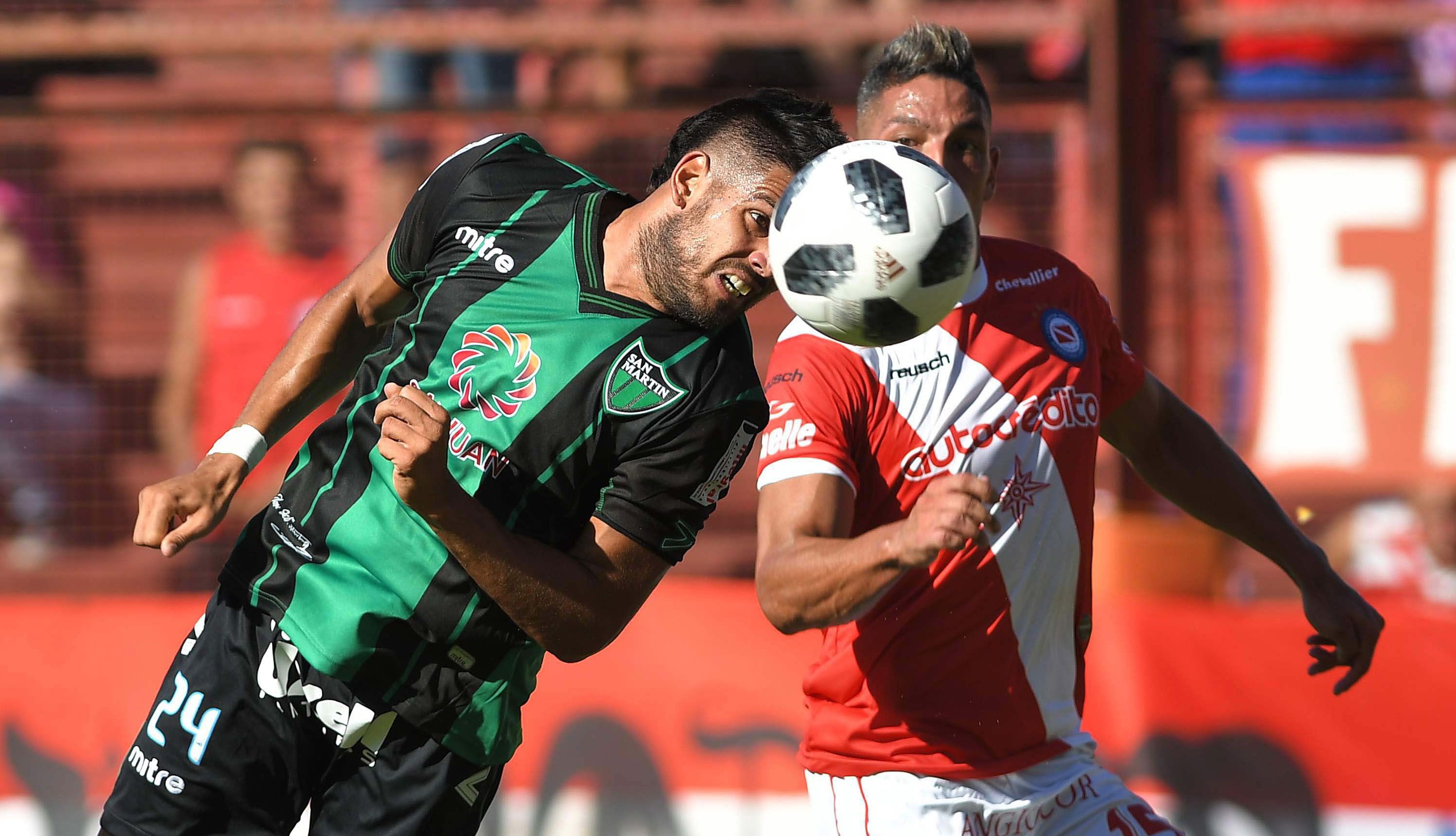 Sólo arriba. Pablo Magnín fue el único y solitario delantero de San Martín que metió un cabezazo en el primer tiempo que pasó muy cerca del palo y presionó siempre la salida de Argentinos.