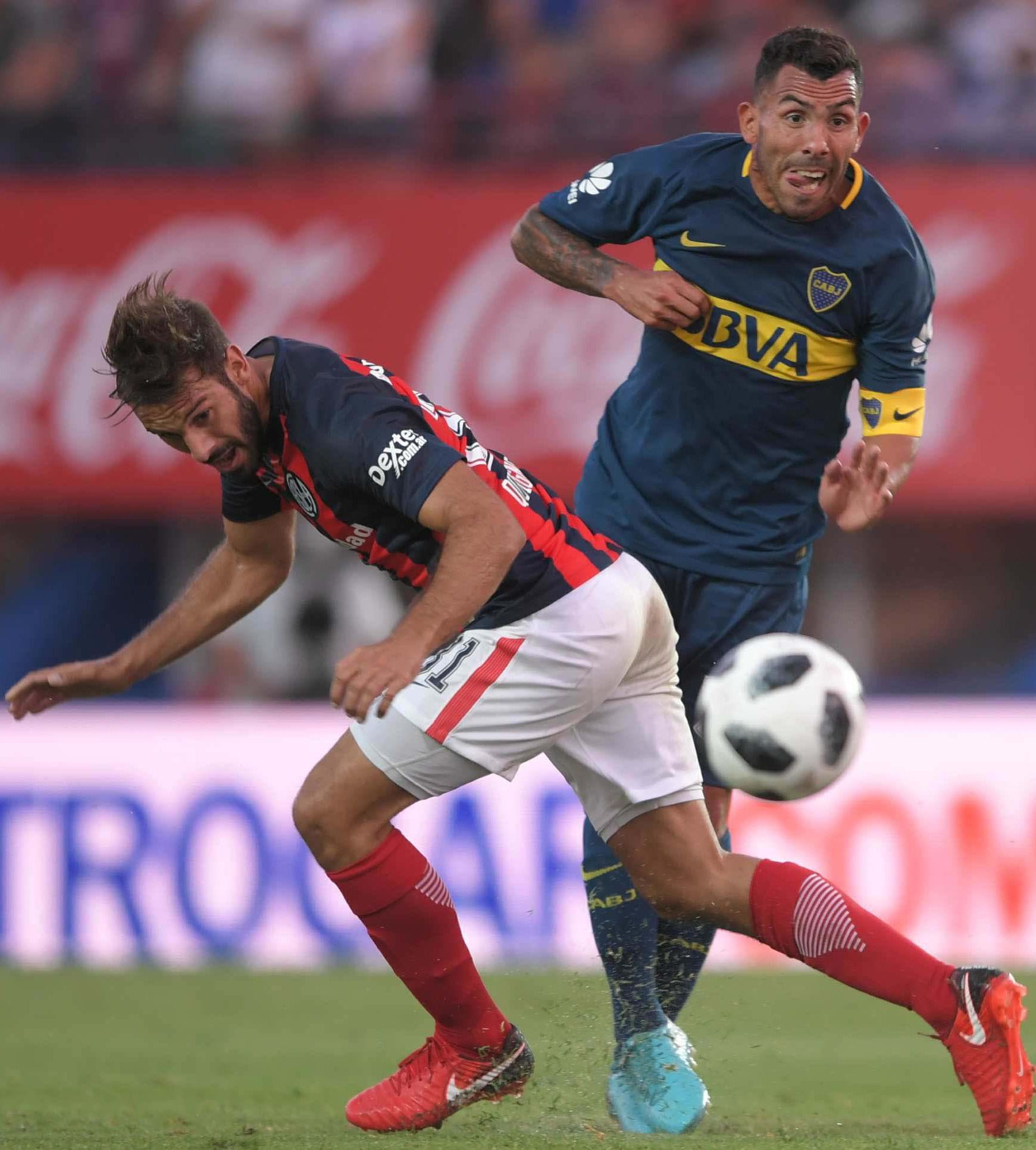 Custodiado. Carlos Tevez busca avanzar ante la marca de un rival de San Lorenzo.