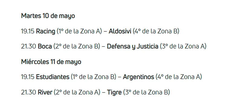 Racing abrirá los cruces este martes desde las 19.15 en el Cilindro de Avellaneda ante Aldosivi, teniendo en cuenta que será local porque terminó en la primera colocación de la Zona A con 30 puntos. En el segundo turno se desarrollará el encuentro de la polémica: Boca Juniors recibirá a Defensa y Justicia desde las 21.30 en la Bombonera, por lo que el elenco de Florencio Varela no podrá mover su encuentro a pesar de exigir un mayor tiempo de descanso.