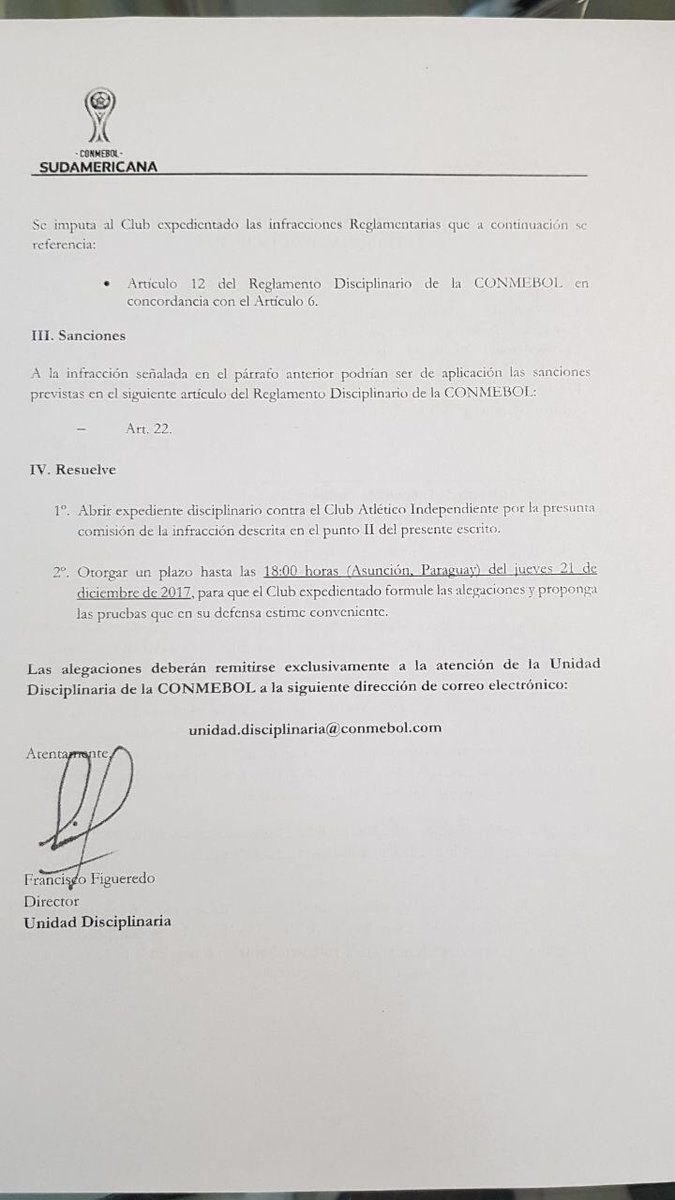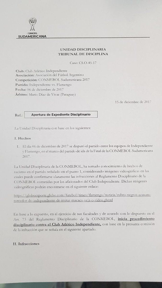 Según el expediente disciplinario, Conmebol “ha tomado conocimiento de hechos de racismo (…) considerando imágenes videográficas en las cuales puede confirmarse claramente las infracciones”. El club se expone a una multa de 10 a 13 mil dólares.