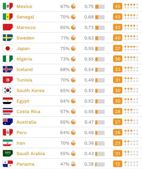 De acuerdo con el índice que crearon, que combina el porcentaje promedio de partidos jugados de liga de cada uno de los 23 futbolistas más utilizados por cada país en las Eliminatorias con el promedio del nivel de sus clubes, el combinado de Julen Lopetegui es el mejor preparado para la Copa del Mundo.