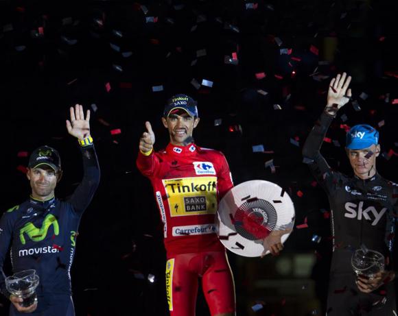 El ciclista español Alberto Contador (Saxo-Tinkoff) logró ayer su tercera Vuelta a España, que concluyó con una contrarreloj de 9,7 kilómetros en Santiago de Compostela ganada por el italiano Adriano Malori (Movistar). Contador, vencedor en las ediciones de 2008 y 2012 fue escoltado en la clasificación general por el el británico Chris Froome (Sky) y su compatriota Alejandro Valverde (Movistar).