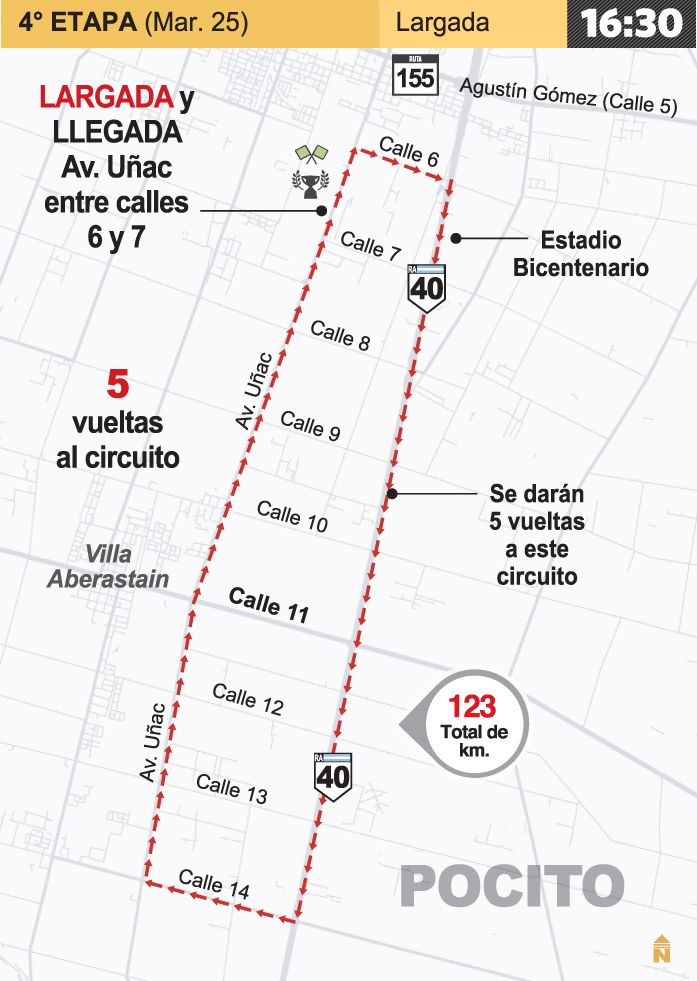 Esta tarde se disputará una etapa, con características clásicas de un tramo de los llamados de transición, porque serán 123 kilómetros que se cubrirán con cinco giros a un circuito (rectángulo) que se realizará en Pocito. Con largada y llegada, frente a la ex fábrica de motos, el pelotón transitará al Norte, hasta calle 6, luego se empalmará con Ruta 40 (al Sur), para posteriormente girar al Oeste, por calle 14, y retomar por la Av. Joaquín Uñac (ex calle Mendoza) y cumplir con los casi 25.000 metros que tiene cada giro (ver infografía).