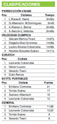 Hubo un antes de esa definición quirúrgica realizada por Contreras. El complemento lo conformaron tres pruebas dos por equipos y una individual (es un decir porque en el scratch hubo juego de equipos). Las tres otorgaron similar puntaje (6-5-4-3-2-1), con la diferencia que en las colectivas esas cifras se dividen en la cantidad de corredores que integran los conjuntos. Como en la persecución eran dos, Laureano Rosas y Emiliano Ibarra, sumaron 3 puntos cada uno. En la velocidad olímpica, Contreras que fue segundo con Costa y Díaz, sumó 1,66.