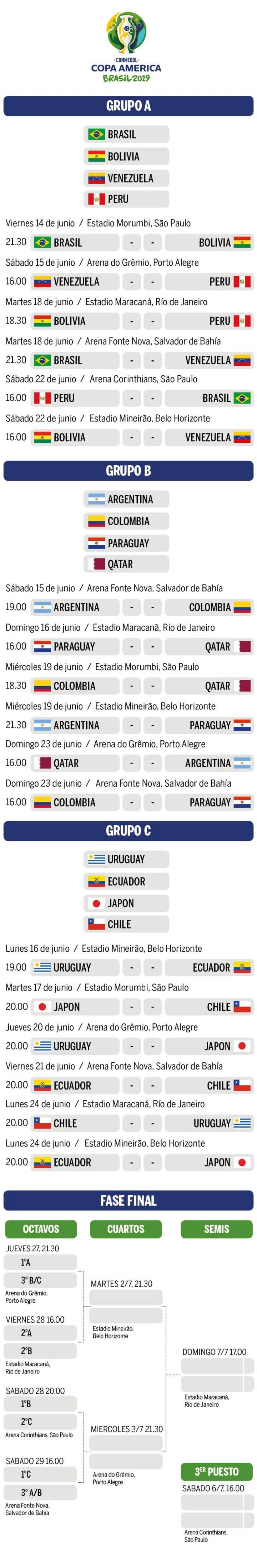 En su cuadragésima sexta edición, la Copa América, que regresa a Brasil tras 30 años de ausencia, será disputada entre el 14 de junio y el 7 de julio por los diez miembros de la Conmebol (Argentina, Bolivia, Brasil, Chile, Colombia, Ecuador, Paraguay, Perú, Uruguay y Venezuela) y por Japón y Qatar como países invitados.