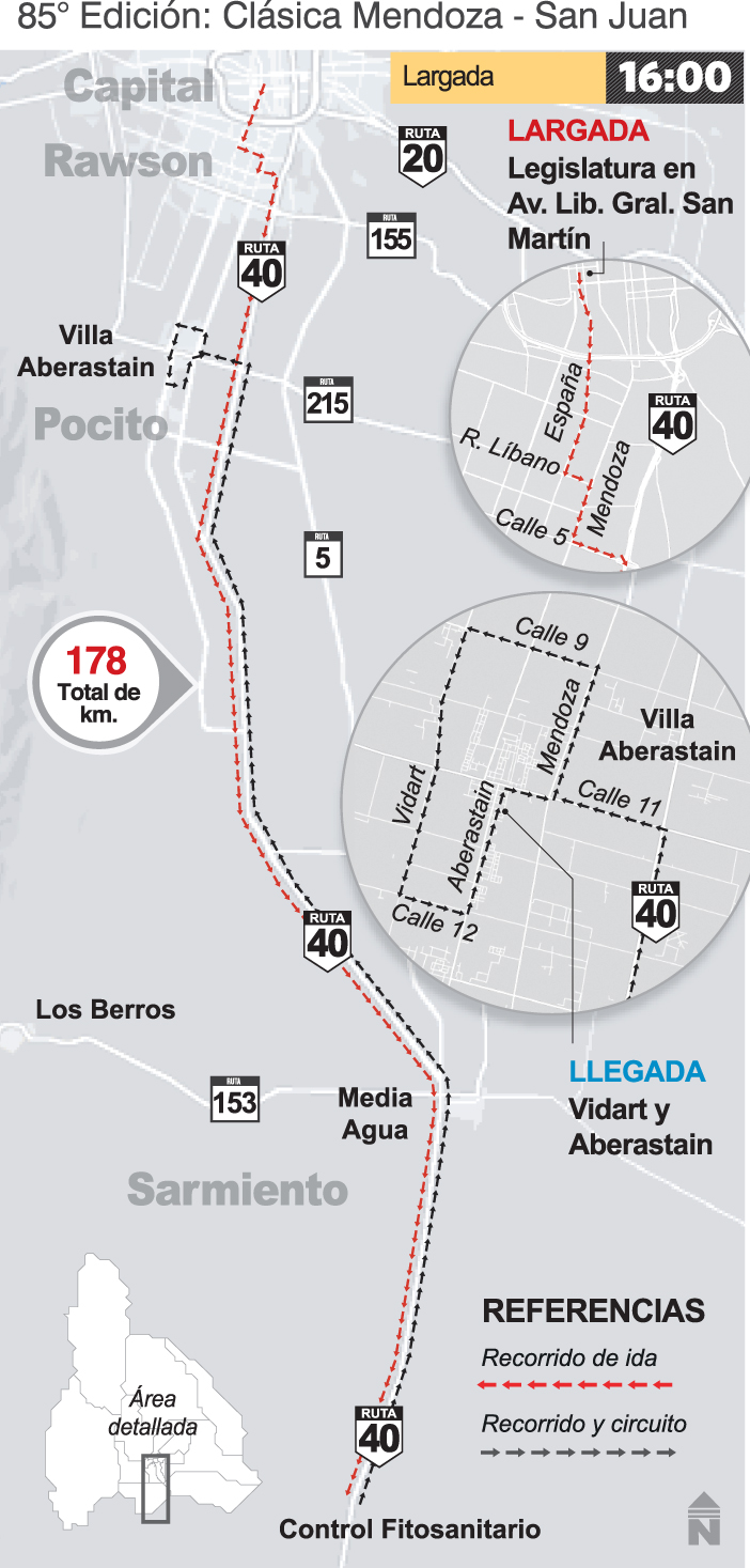 La carrera se largará a las 16 desde la Legislatura provincial, y luego de ir hasta el límite en el control fitosanitario de San Carlos, retornará por la ruta 40 hasta ingresar a suelo pocitano, donde luego de recorrer un giro y fracción de un circuito (ver infografía) culminará en el corazón de la Villa Aberastain.