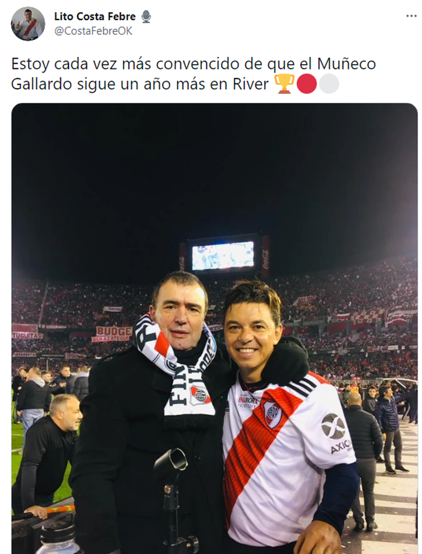 Gallardo todavía no confirmó si seguirá en River después del 31 de diciembre, cuando se vence su contrato, pero Costa Febre aseguró que tiene fuentes confiables que lo hacen sentir “cada vez más convencido de que el Muñeco Gallardo sigue un año más”.