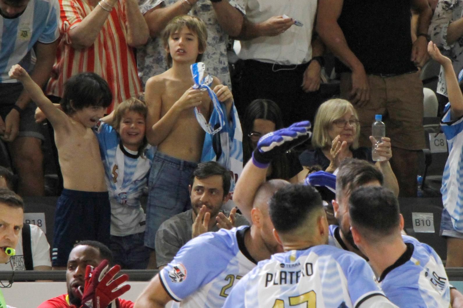 De pelo rubio hasta los hombros, con el torso descubierto y la camiseta de la Selección Argentina en sus manos. Bien apretada. Los pequeños Cristiano y Román Nicolía, llaman la atención cada noche en el Aldo Cantoni. Son los hijos de Carlos Nicolía, el capitán de Argentina y los pequeños "barrabravas" de la Albiceleste.