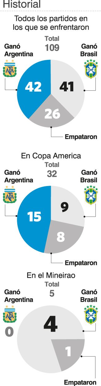 Los fríos números son relativos, pero marcan una tendencia como mínimo. Y en este último tiempo, Brasil ha sido superior en los mano a mano. De ahí, que se entienda que hace 14 años que Argentina no celebra en un clásico "oficial". Fue el 8 de junio del 2005 por las Eliminatorias en el estadio de River: 3-1 con los tantos de Hernán Crespo (2) y aquel zurdazo que aún se recuerda de un tal Román Riquelme, que por entonces lucía la camiseta número 8 en su espalda. Del lado visitante estaban auténticos cracks como Roberto Carlos, Rivaldo y Ronaldinho, entre otros.