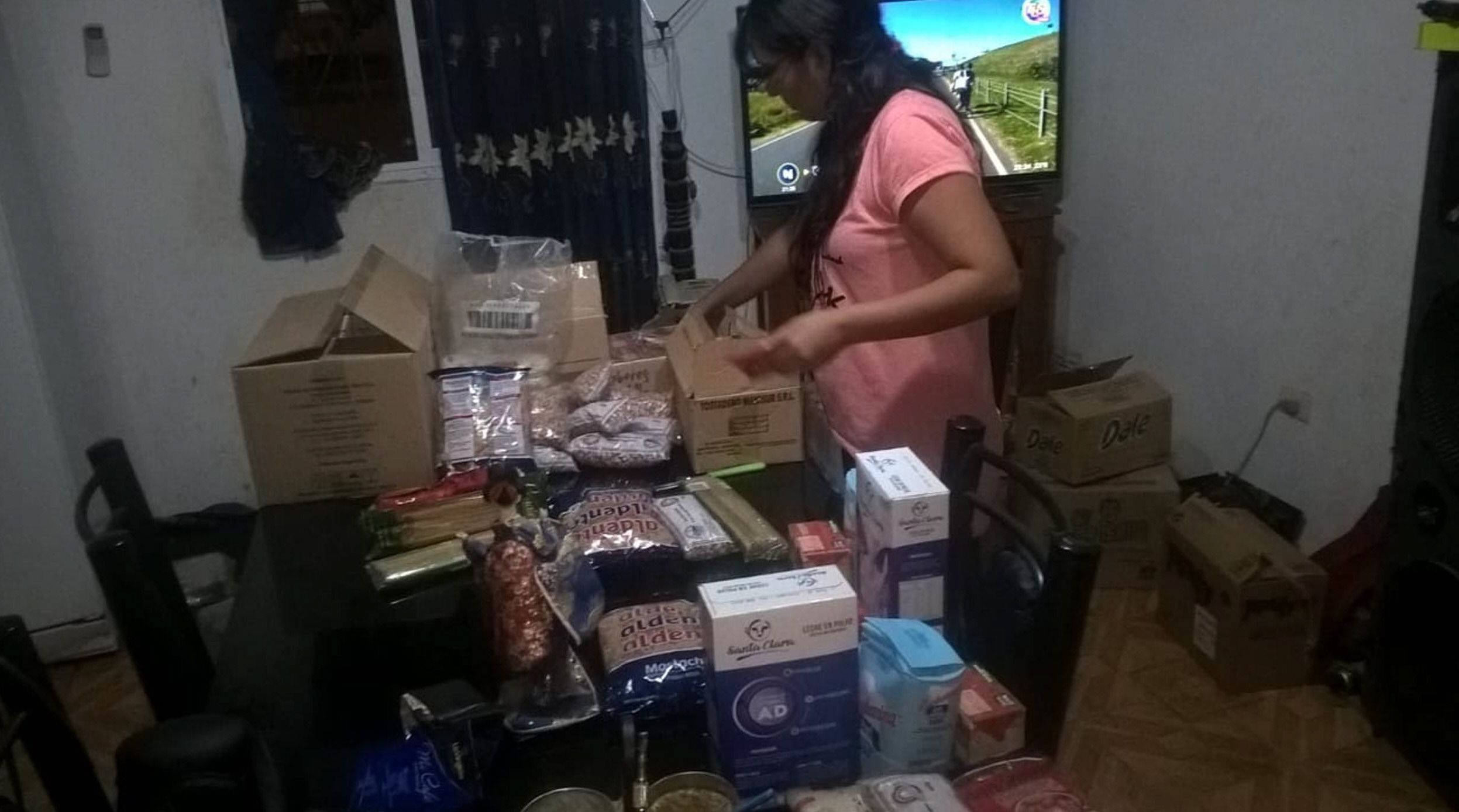 Ayudados por la ONG San Juan Solidario, dirigida por Daiana Luna Font y Luciano Cano, arman bolsones de alimentos no perecederos para distribuir entre los alumnos. Belén, esposa de Mauricio, aporta su granito de arena en la tarea de empaquetarlos.