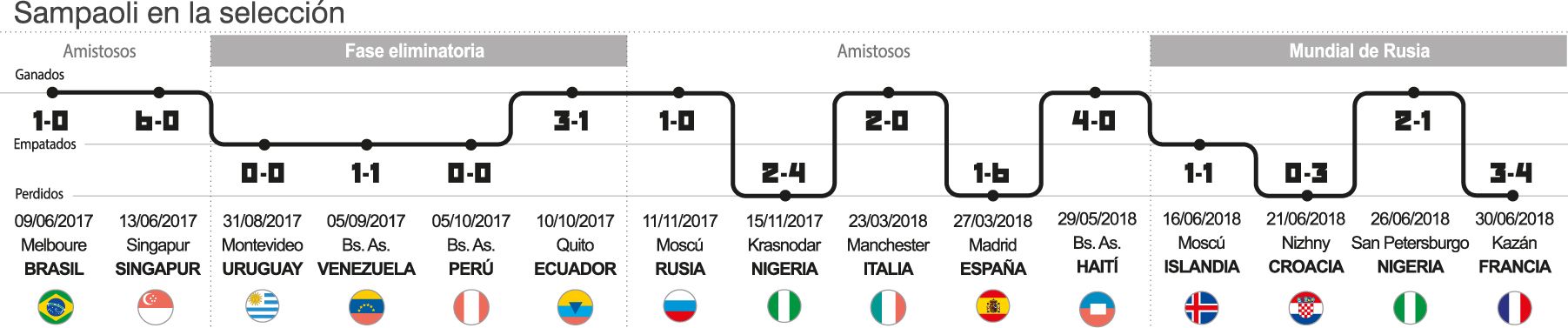 Pero lo peor de su corto y nefasto ciclo estuvo en la cancha. Autocatalogado como un improvisador serial, fue víctima de su propia verborragia. Sin proyecto concreto, entregado a sus vaivenes intelectuales, Sampaoli quiso inventar lo que ya está inventado. De la línea de tres al falso 9: esa fue su olvidable propuesta para una Argentina que nunca se vio como equipo. Con lo que implica un equipo en un juego de conjunto donde las individualidades marcan diferencias, Sampaoli tuvo el mérito de debilitar a un tal Messi. En Eliminatorias, jugó 4 partidos y solamente ganó 1. Hizo amistosos de poca monta y en los que fueron de verdad, lo masacraron como España que lo goleó 6-1. En lo colectivo jamás encontró un perfil, una línea, un ADN de saber a qué jugaba Argentina. Nunca se supo. Nunca lo demostró. De insistir con su famosa línea de tres en el fondo a terminar probando con un falso nueve. Ese fue su aporte táctico para que Argentina terminara afuera del que debió ser su Mundial. Argentina nunca tuvo libreto. Argentina quedó indocumentado, sin DNI.