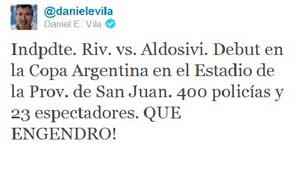 “Independiente Rivadavia –Aldosivi en el estadio de San Juan. 400 policías y 23 espectadores. ¡qué engendro!”, escribió Vila en su cuenta de Twitter minutos antes del comienzo del partido en San Juan.