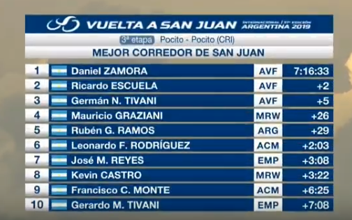 Los mejores tres mejores sanjuaninos de la tercera etapa son representantes de la Agrupación de la Agrupación Virgen de Fátima. Daniel Zamora, terminó a 1 minuto 7 segundos del líder Julian Alaphilippe y se ubicó 23ro.