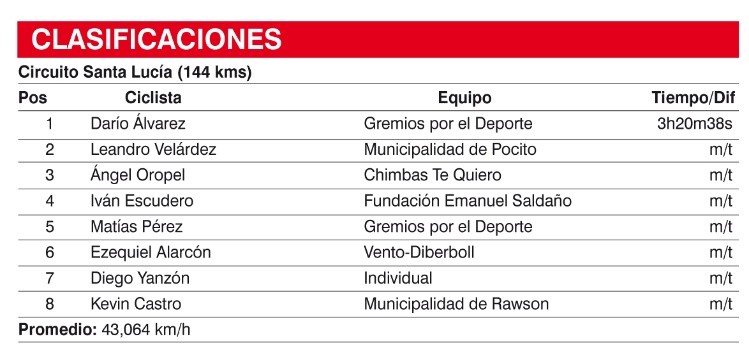 A la carrera la ganó el riocuartense Darío Álvarez (Gremios por el Deporte), quien tuvo más velocidad en el momento supremo que Leandro Velárdez (Municipalidad de Pocito) y el catamarqueño Ángel Oropel (Chimbas Te Quiero). Los tres, que en una eventual apuesta no eran los que menos pagaban si ganaban; sobrevivieron a una rodada ocurrida a una cuadra de la línea de meta, de la que no pudieron zafar quienes a prima fase tenían todos los boletos para quedarse con la victoria, entre ellos Leonado Cobarrubia (SEP-San Juan), Gerardo Tivani (Municipalidad de Pocito) y Alan Ramírez (Chimbas Te Quiero), los tres citados ganadores de distintas carreras en el transcurso de esta entrecortada temporada.