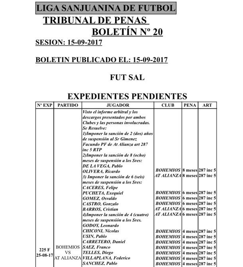 Luego de los descargos, de la presentación de pruebas, informes, videos y demás, finalmente el Tribunal de Penas de la Liga Sanjuanina se expidió sobre el escandaloso final que tuvo el partido que Bohemios y Atlético Alianza protagonizaron el día 25 de agosto por una fecha del Torneo Clausura de Primera A del futsal sanjuanino. Fue tal el nivel de violencia que se esperaban sanciones ejemplificadoras y en parte lo son porque los sancionados son 25 protagonistas, siendo el más castigado el preparador físico de Atlético Alianza, Facundo Giménez quien fue suspendido por 2 años. Luego, en orden descendente, Pablo De la Vega (Bohemios) y Ricardo Olivera (Alianza) recibieron una pena de 8 meses sin poder jugar. Con 6 meses de suspensión fueron castigados los jugadores Felipe Cáceres, Exequiel Pucheta, Osvaldo Gómez (Bohemios) y Cristian Barros más Gonzalo Castro (Alianza). Finalmente, las sanciones más leves afectan a 17 de los restantes jugadores con 4 meses de suspensión siendo el listado el siguiente por el lado de Bohemios: Leonardo Godoy, Nicolás Chiconi, Pablo Usin, Daniel Carretero, Franco Saez, Diego Telles, Federico Vilaplana, Pablo Sánchez, Marcos Regato, Mauro Guzmán y Sebastián Quiroga y por el lado de Alianza, Marcos Costela, Víctor Montañez, Cristian Cabrera, Yamil Felez, Cristian Castilla y Leam Rojo. Además, se les dio a ambos por perdido el partido 0-1 y se clausuró la cancha de Planeta Gol por tres fechas.
