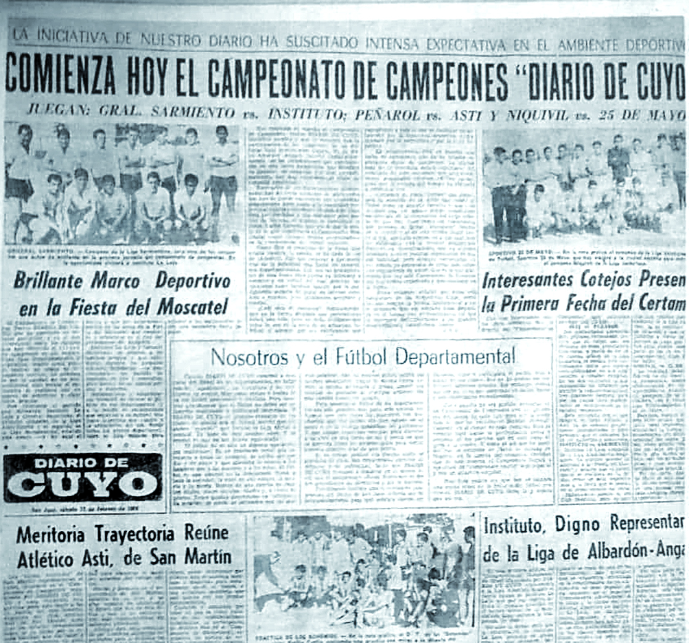 En 1966 cambió para siempre la historia del fútbol del interior sanjuanino. Con la idea original del fundador y director por entonces de DIARIO DE CUYO, Francisco Salvador Montes, se creó el primer Campeonato de Clubes Campeones. La intención de Don Francisco era unir a los departamentos sanjuaninos con un deporte tan popular y arraigado como el fútbol, siendo este medio el que comunicaría justamente las novedades de cada equipo en los partidos. Con ello, la pasión de los habitantes de cada club por sentirse representados le darían un plus que se mantiene hasta la actualidad y que justamente es el motor de este evento que desde hoy tendrá su edición número 53. Con Tito Torres encargado de la sección Deportes de DIARIO DE CUYO en aquellos tiempos, en ese febrero se dio el inicio al novedoso campeonato que contó con seis participantes. El sistema de disputa fue todos contra todos, siendo finalmente el campeón Asti Talacasto de Angaco. Además, dijeron presente en esa edición del bautismo: Peñarol de la calle Chile, Instituto La Laja de Albardón, Sarmiento de Media Agua, Niquivil de Jáchal y Sportivo 25 de Mayo.