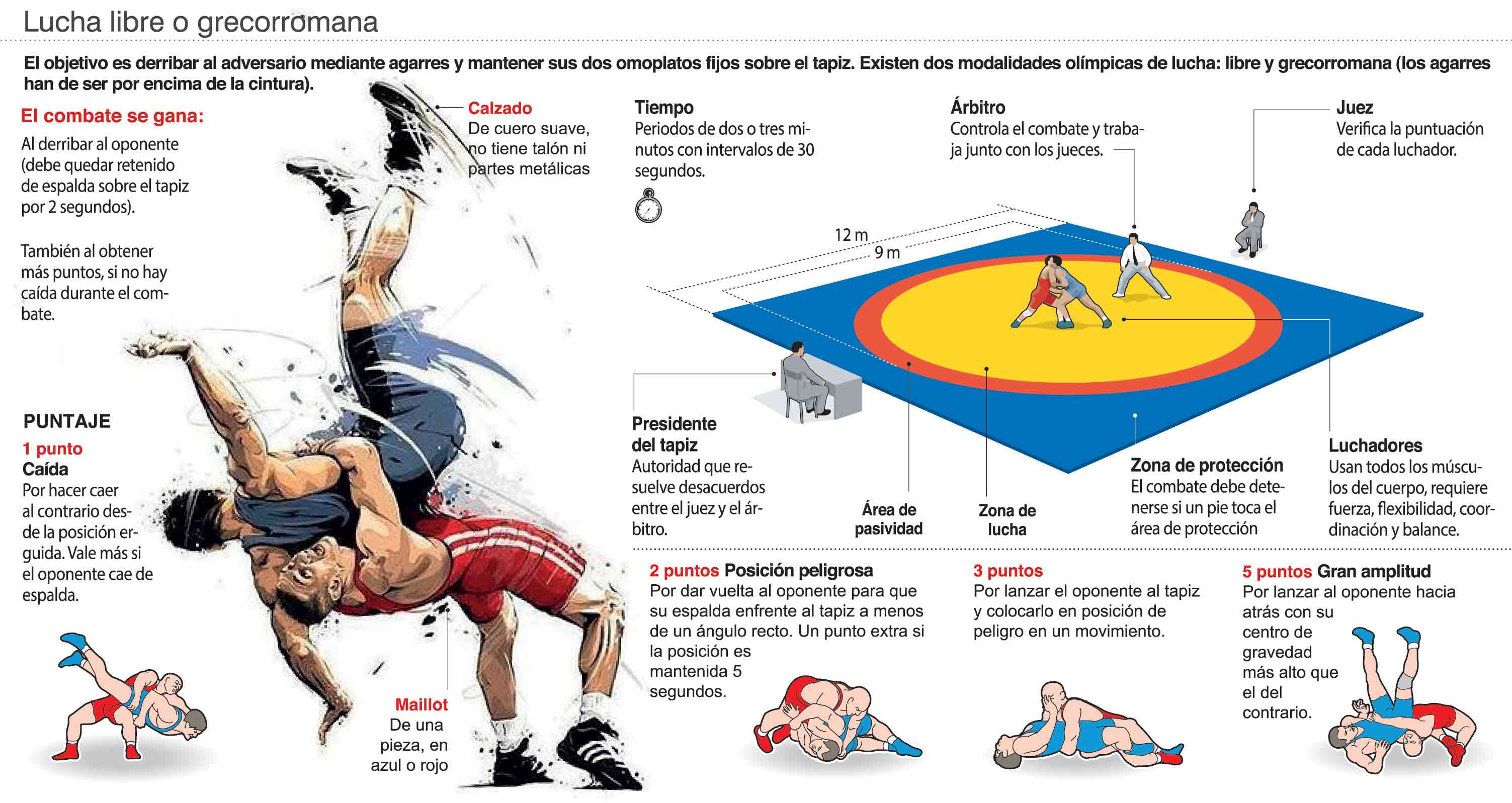 La Lucha Olímpica o Wrestling es un deporte de combate donde se lucha sobre una superficie llamada tapiz o colchón, el área de competencia tiene forma circular. El objetivo es "planchar", o sea poner al rival de espalda al suelo y que toque con ambos omóplatos en el tapiz o por la sumatoria de puntos que otorgan los derribos y demás movimientos técnicos. No se puede golpear, ni palanquear las articulaciones ni realizar estrangulamientos. Lo que la convierte dentro de los deportes de combate en una actividad bastante segura.