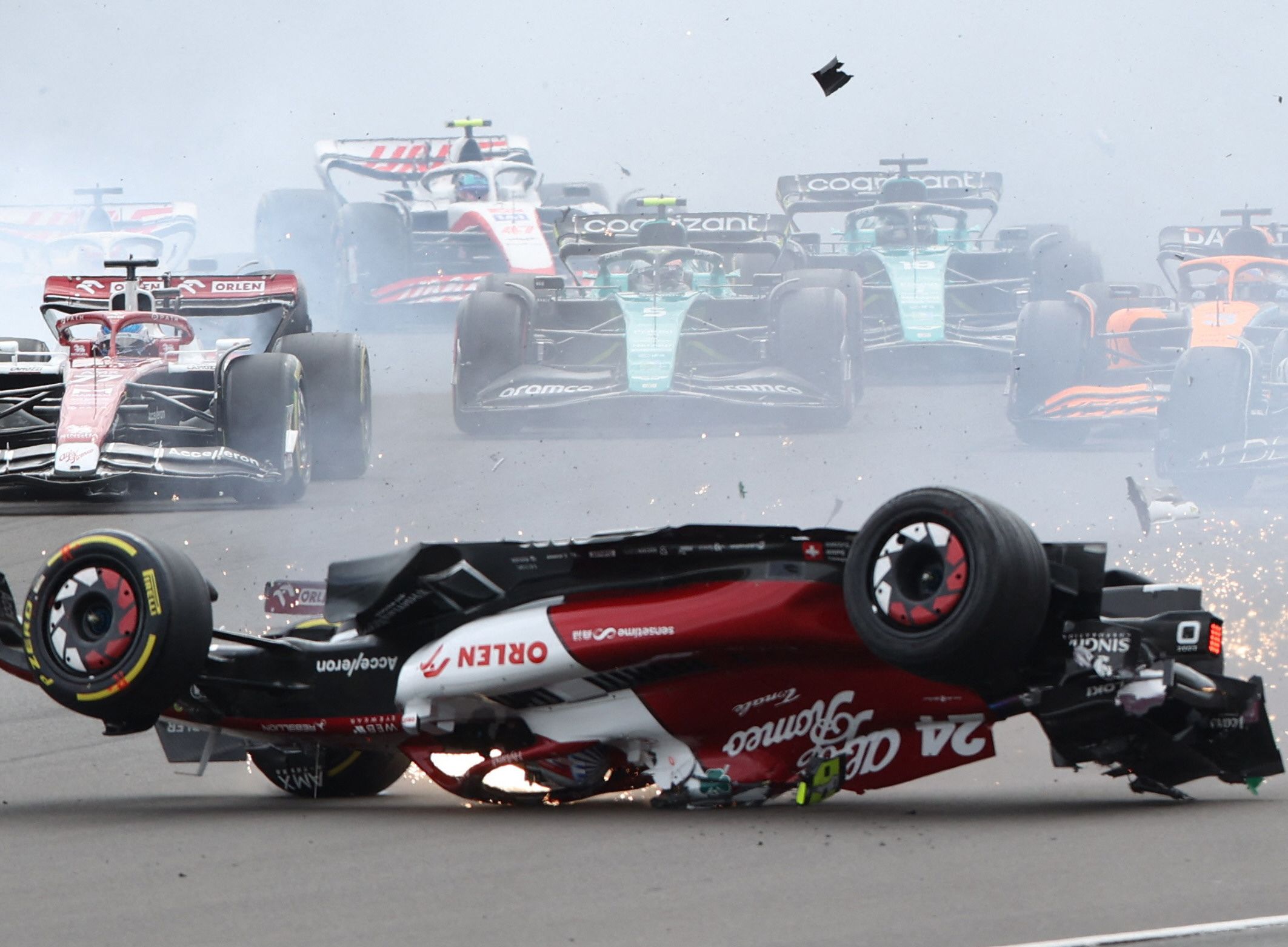Tras ese recorrido boca abajo, el Alfa Romero de Zhou se elevó por encima de las protecciones y terminó incrustado contra las vallas que separan la pista de los espectadores ubicados en la tribuna de la curva 1.