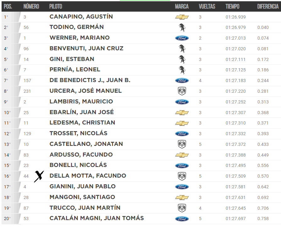 “En los ensayos libres tuvimos algunas complicaciones que me impidieron girar todo lo que hubiese querido. En la segunda tanda sólo pude dar 6 vueltas y seguíamos en el puesto 35. El equipo debió trabajar en el Dodge para buscar la mejor perfomance en clasificación”, comentó Facundo al finalizar los entrenamientos.